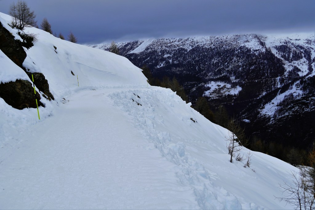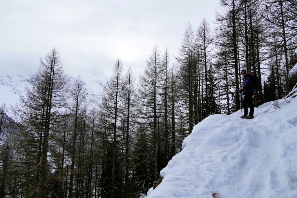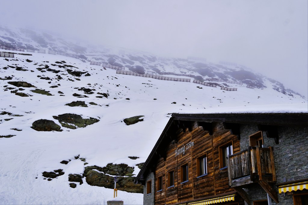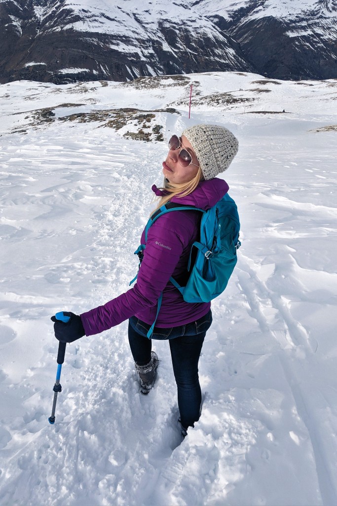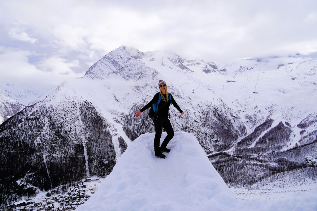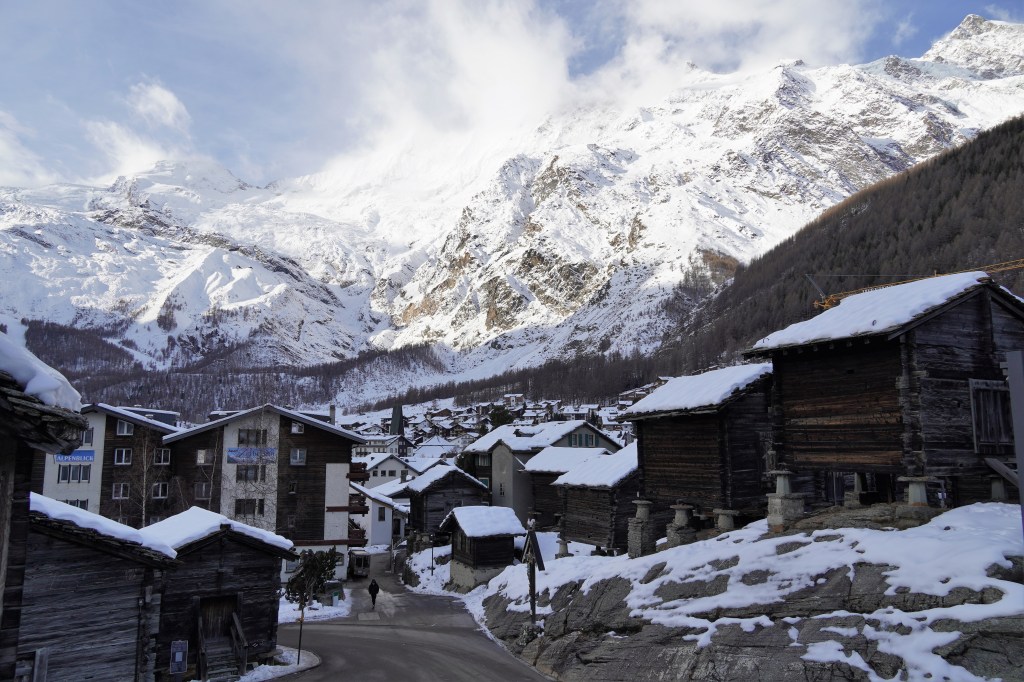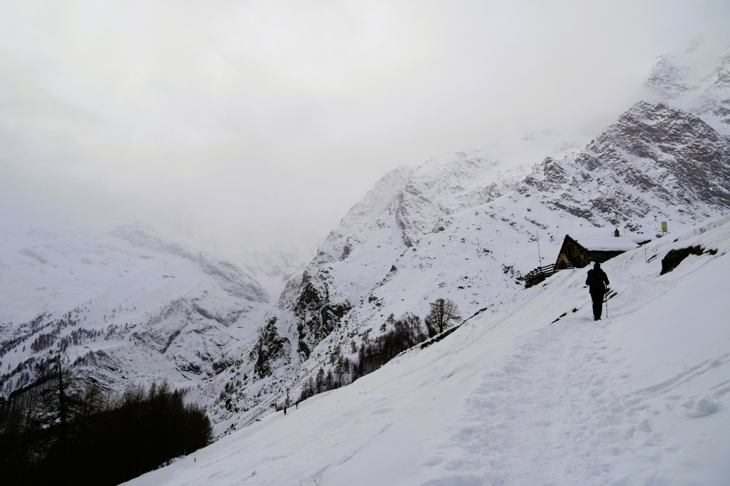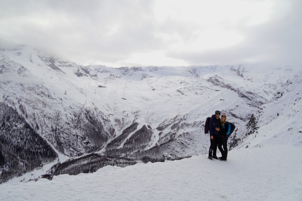 Our first venture was to Saas-Fee, a beautiful village located on a plateau that is surrounded by thirteen 4,000-meter peaks. Unfortunately, given the lack of snow this winter, our snowshoes were not necessary for our planned snowshoe hike. So, after strapping our snowshoes to our backpacks, we headed up the mountain regardless. Despite the relentless uphill terrain, we marveled at the gorgeousness of the surrounding mountains. The intermittent clouds just made the snowy peaks a little extra epic.