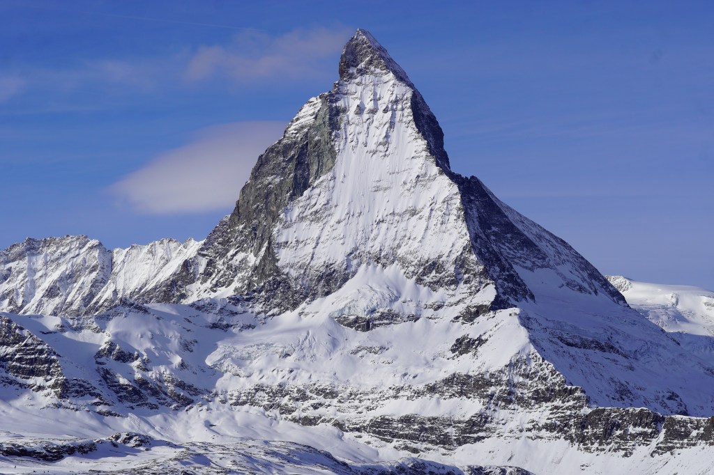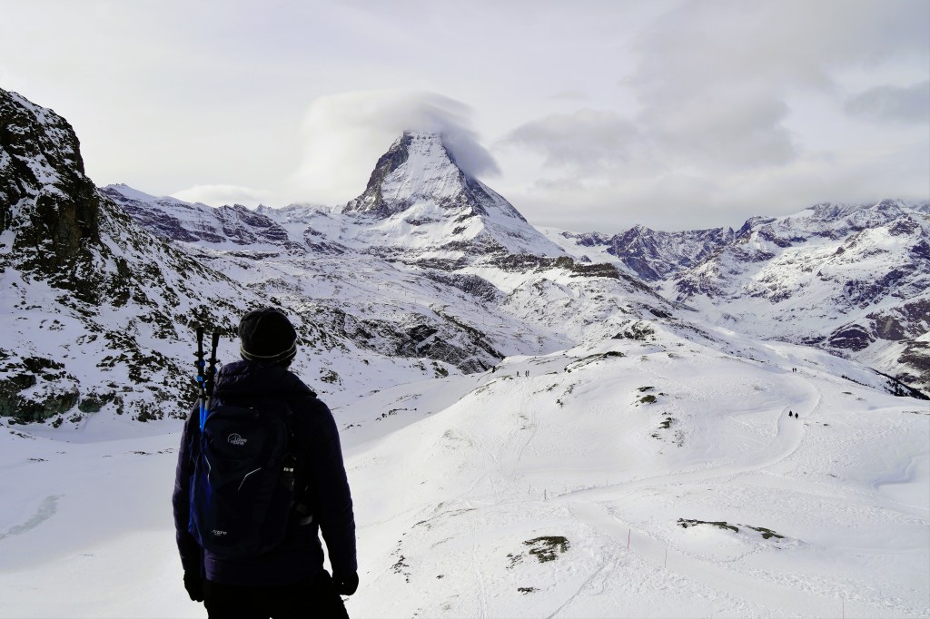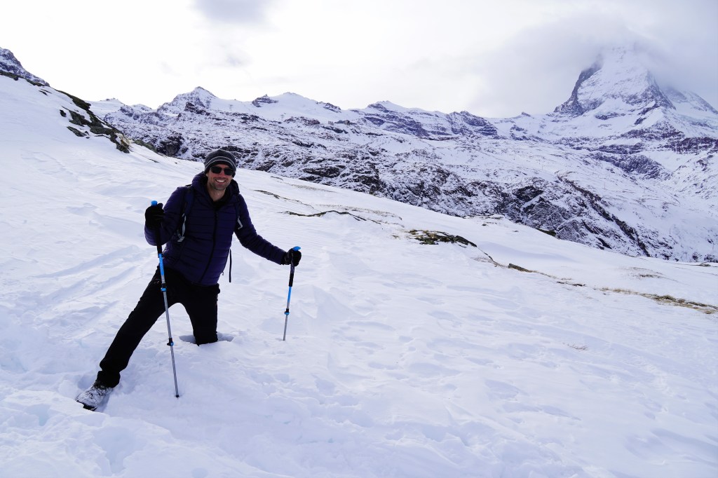 Thinking that we were smart given the low snow conditions in Saas-Fee, we took off for Zermatt the next morning sans snowshoes. Home to perhaps Switzerland’s most famous peak, thanks to Disneyland and Toblerone, we were lucky to have the perfect weather conditions for Matterhorn viewing. And considering our ascent-heavy hike from the previous day, we were happy to do a more descent-focused hike. We first took a cog railway up to the Gornergrat, a 3,000-meter peak that offers stunning 360-degree views of the area. While the Matterhorn is admittedly pretty impressive in how it rises above the smaller adjacent peaks, you can’t discount the other twenty-eight 4,000-meter peaks that are visible from the Gornergrat, including Switzerland’s highest peak, the Monte Rosa massif. All of that, combined with glaciers in all directions—like the Gorner Glacier, the second-largest glacier in the Alps—and the perfect blue skies, made for an incredible day in the mountains. After extracting ourselves from the crowds of skiers and tourists taking pictures in front of the Matterhorn holding Toblerone chocolate (there were hundreds of them!), we were ready to hit the trail.