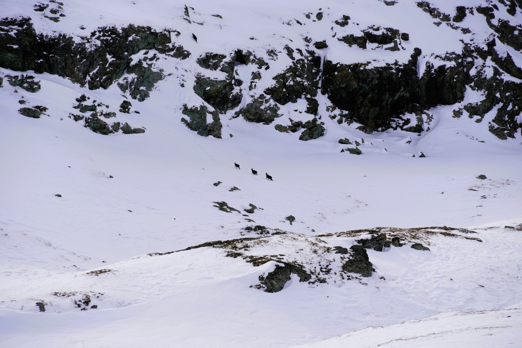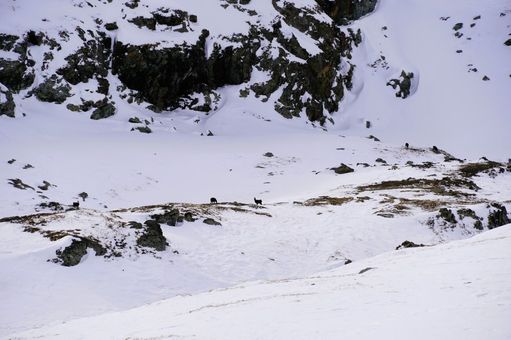 We were joined halfway through our trek by a herd of chamois hanging out on a plateau below us. We stopped and admired them as they pranced through the deep snow much more gracefully than we were.