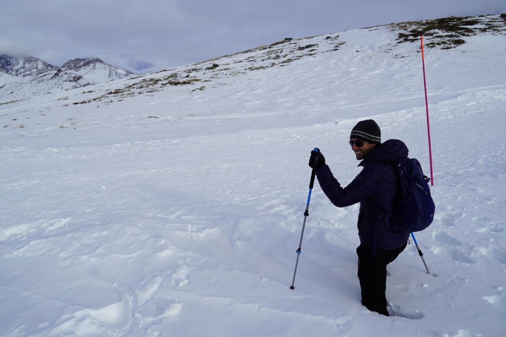 It was difficult to even begin hiking because we couldn’t stop exclaiming over the views in all directions. We were happy that our trail was above the tree line and thus exposed, affording us uninterrupted views over the terrain. Our “smart” thinking of leaving our snowshoes behind, however, turned out to be not so smart, as we were soon sinking thigh-deep into the snow. As you can tell by our faces, this was cause for giggles and not discomfort; it’s in moments like this that I am reminded of how thankful I am to have a travel partner who makes any situation fun, regardless of what might be considered uncomfortable or inconvenient. Bad weather? Cold temperatures? Deep snow? No problem. It happens to be one of the things I love most about us.