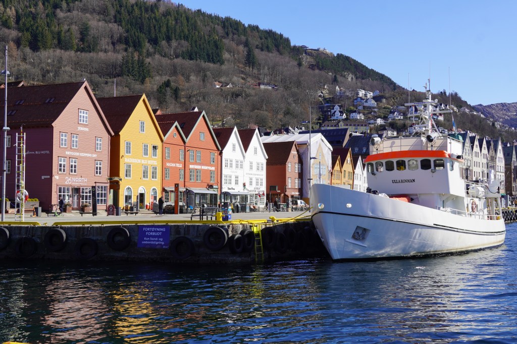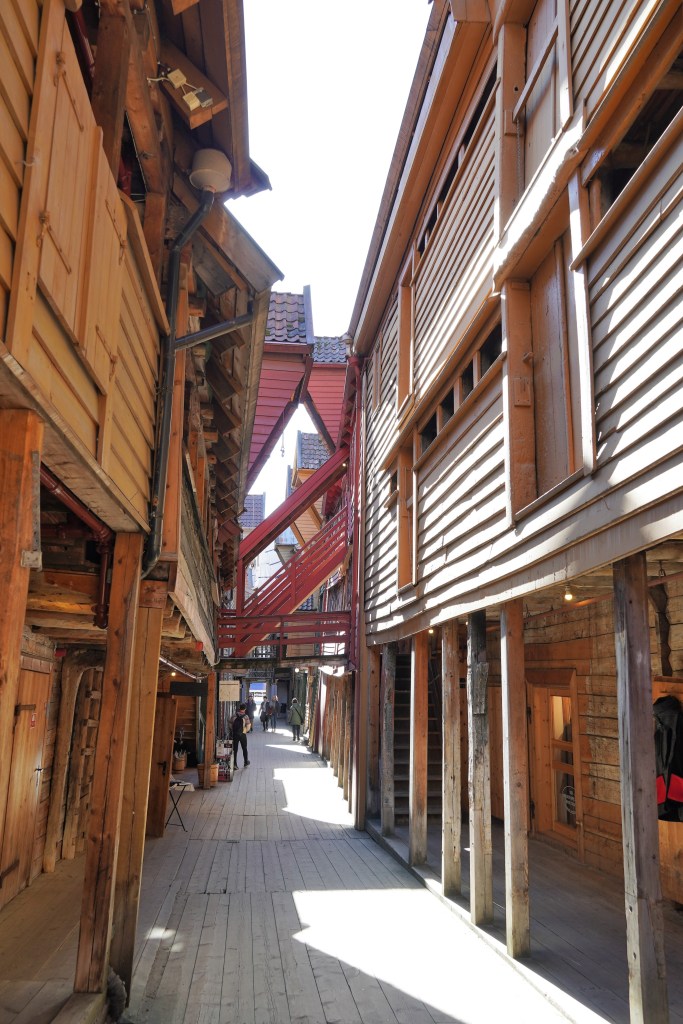 We had a day to enjoy Bergen before embarking on our trip, and we loved every square inch of that city. We stayed right on the harbor in Bryggen, the UNESCO World Heritage waterfront where the city was founded in 1070. The waterfront is full of gorgeous timber buildings that comprised one of the most important trading destinations in northern Europe throughout the Middle Ages. Unsurprising given its characteristic timber construction, Bergen has been plagued by fires over its history. Most of the current colorful buildings were built after the area was destroyed by a fire in 1702.