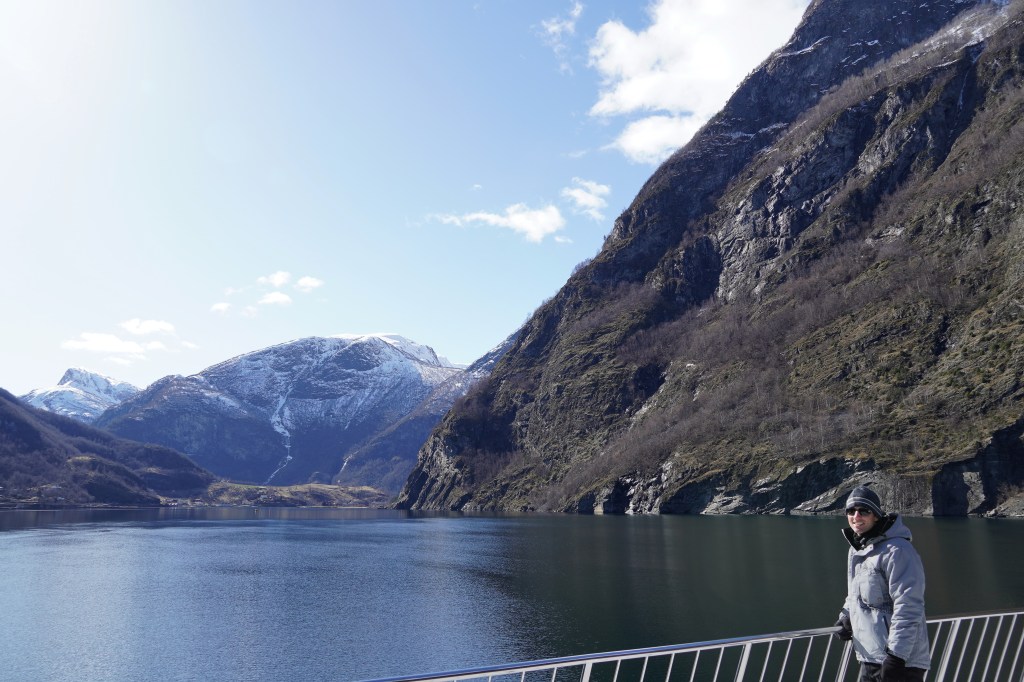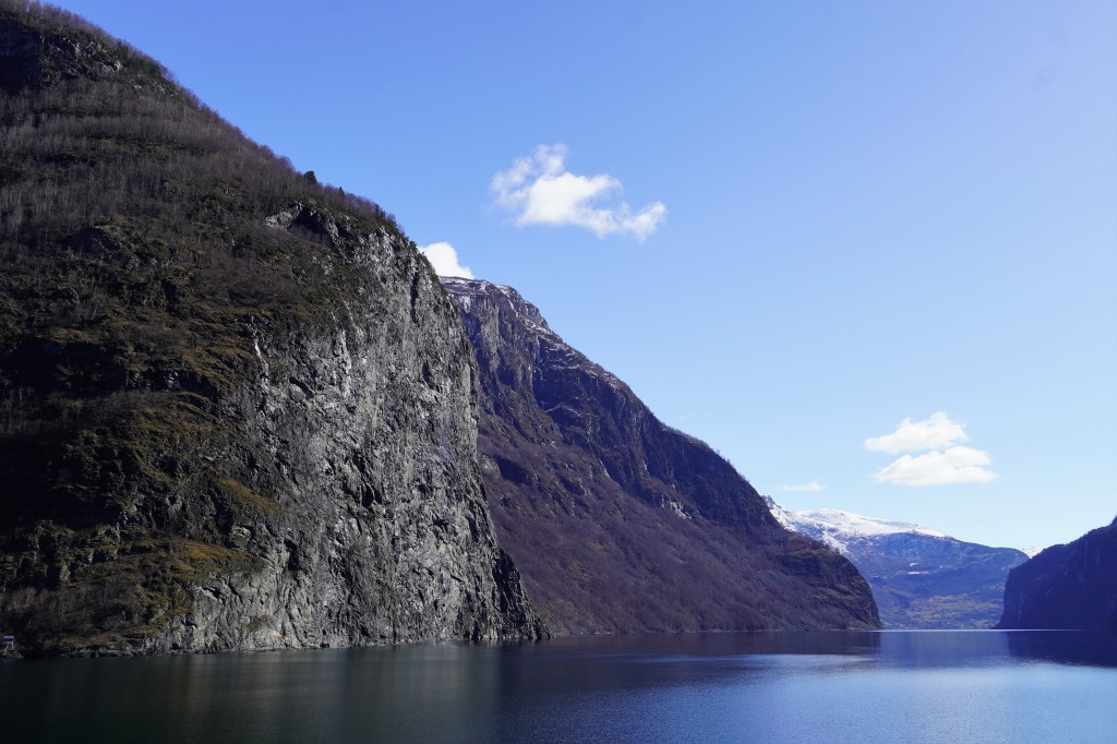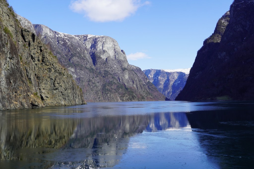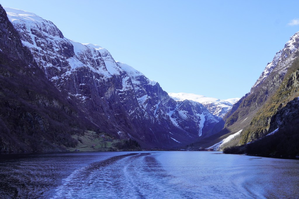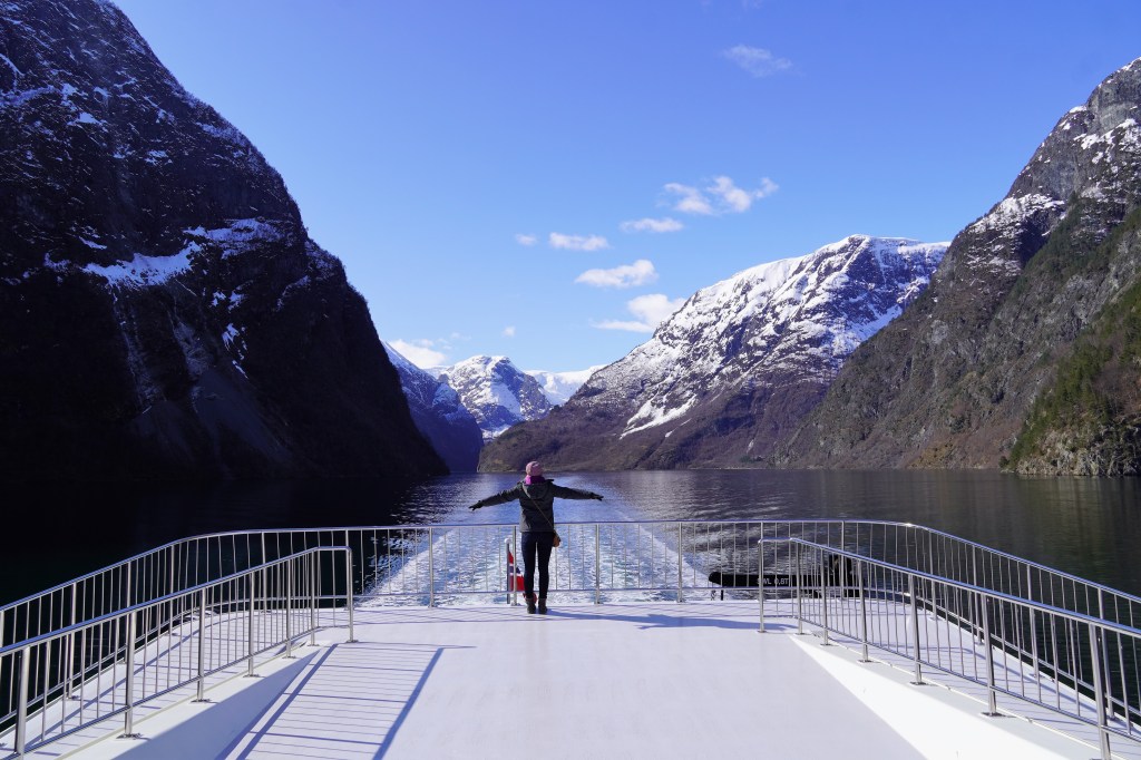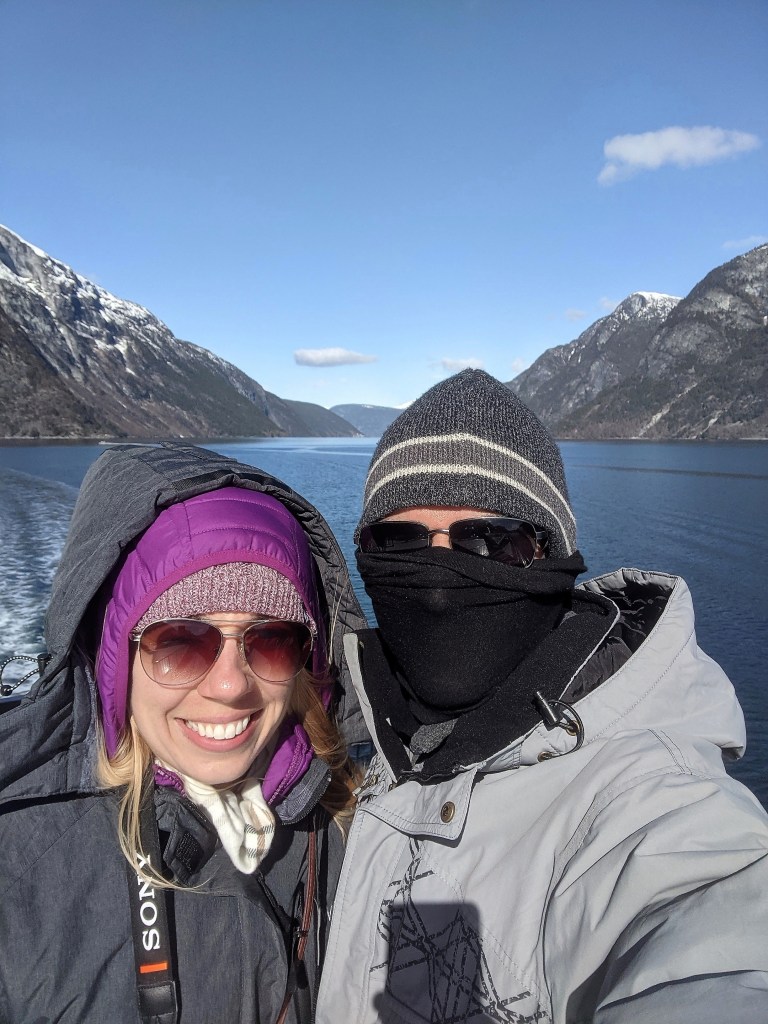We caught a fully electricity-powered ferry boat that first took us up Nærøyfjord, one of the narrowest fjords in the world and a UNESCO World Heritage Site, before making a right-hand turn into Aurlandsfjord. The weather got colder and colder, as was evident by the fact that we kept adding layers to our outfits, but the views got more and more beautiful, and we just couldn’t bring ourselves to stay in the much warmer but way less scenic inside of the boat. At one point, a loud grinding punctuated the quiet and we looked down to see the boat churning through a layer of ice floating on the surface of the water. The sheer cliffs that were carved out by glaciers eons ago dropping into crystal-clear water were simply jaw-dropping.