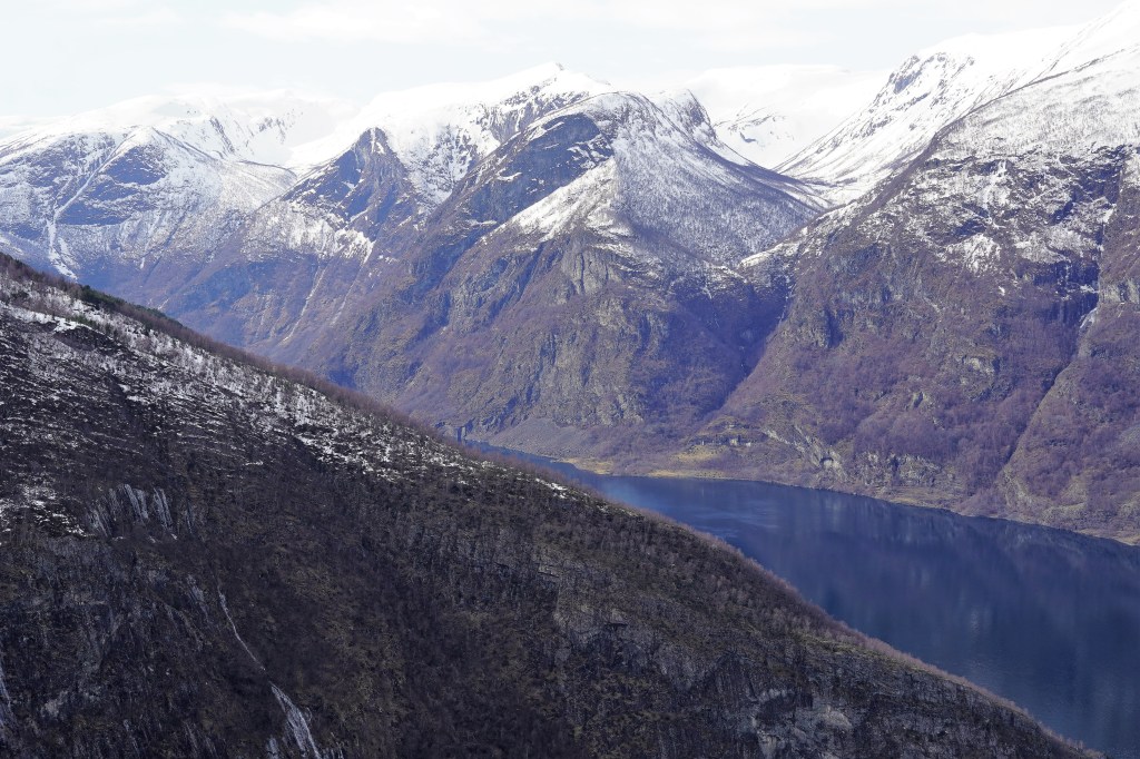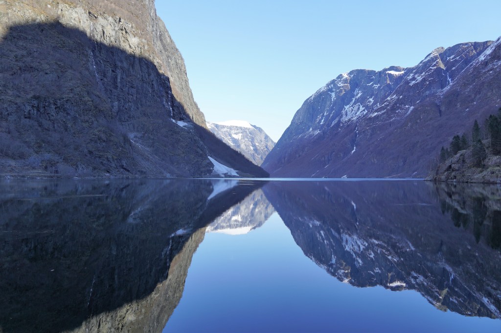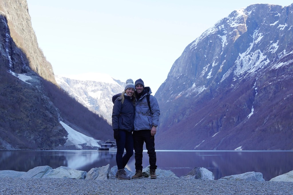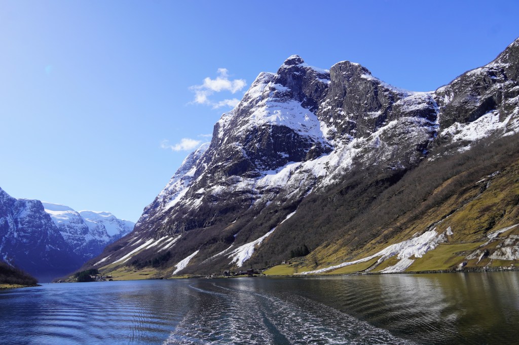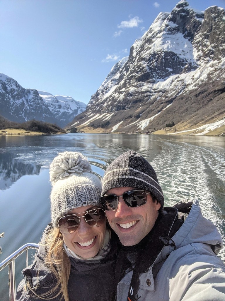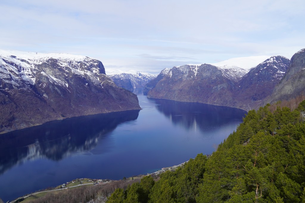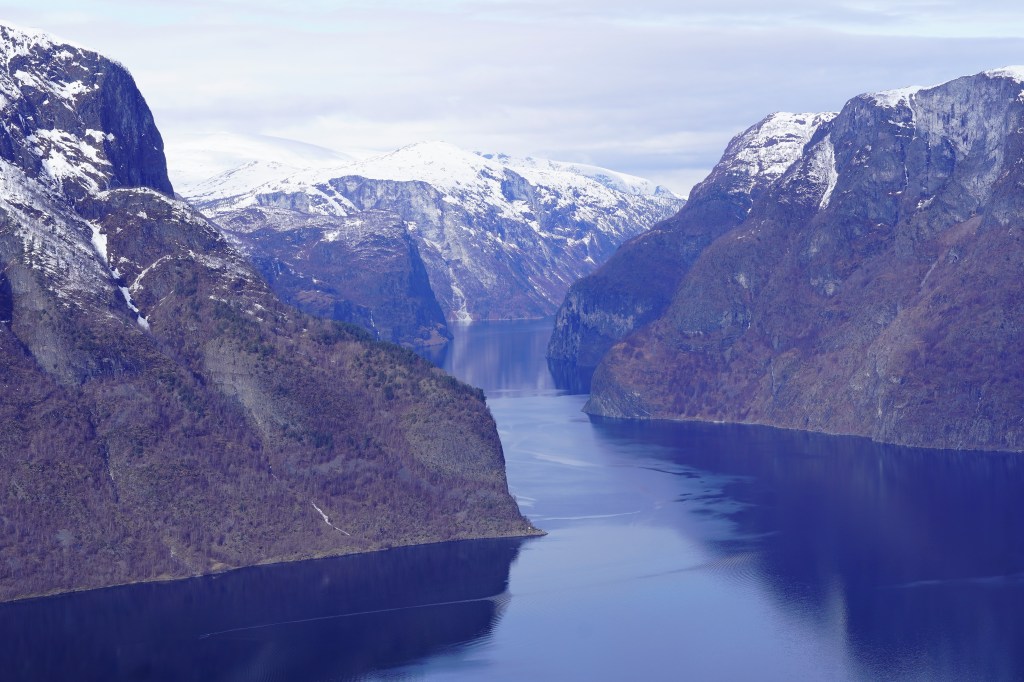We caught a fully electricity-powered ferry boat that first took us up Nærøyfjord, one of the narrowest fjords in the world and a UNESCO World Heritage Site, before making a right-hand turn into Aurlandsfjord. The weather got colder and colder, as was evident by the fact that we kept adding layers to our outfits, but the views got more and more beautiful, and we just couldn’t bring ourselves to stay in the much warmer but way less scenic inside of the boat. At one point, a loud grinding punctuated the quiet and we looked down to see the boat churning through a layer of ice floating on the surface of the water. The sheer cliffs that were carved out by glaciers eons ago dropping into crystal-clear water were simply jaw-dropping.