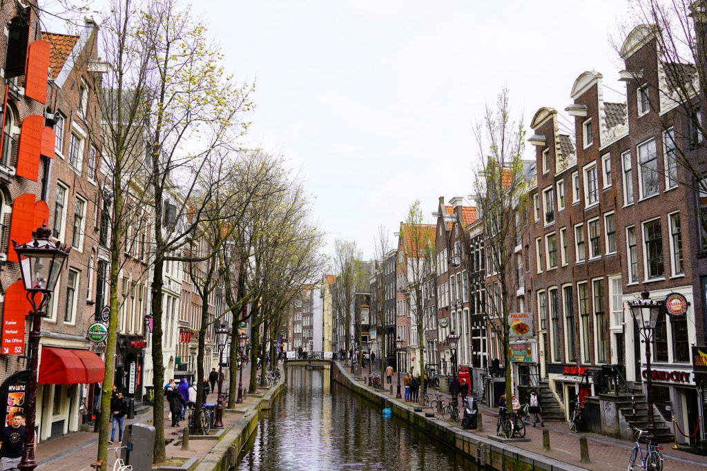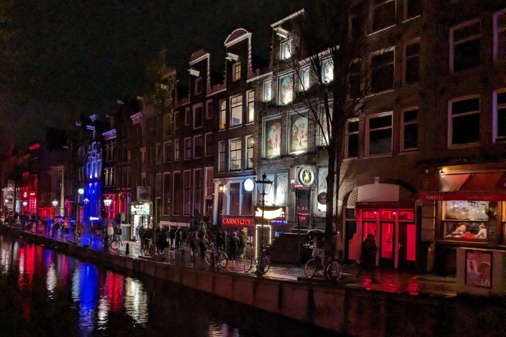 It was fascinating to learn about the culture and politics of the laws legalizing and governing prostitution and marijuana, which were often described as “pragmatic”—as these activities exist in the population regardless of legal status, legalizing them allows the government to regulate them, which hopefully leads to heightened safety and protection for the people working and partaking in these industries. It seems to make logical sense. It was so interesting to see the neighborhood in the relatively calm daytime and appreciate that it is a residential neighborhood, not just a tourist’s playground. Indeed, the 14th-century Old Church and a preschool rub shoulders with sex workers’ windows in the heart of De Wallen. As night fell, the neighborhood became much more bustling, and the famous red lights lit up the entire area.