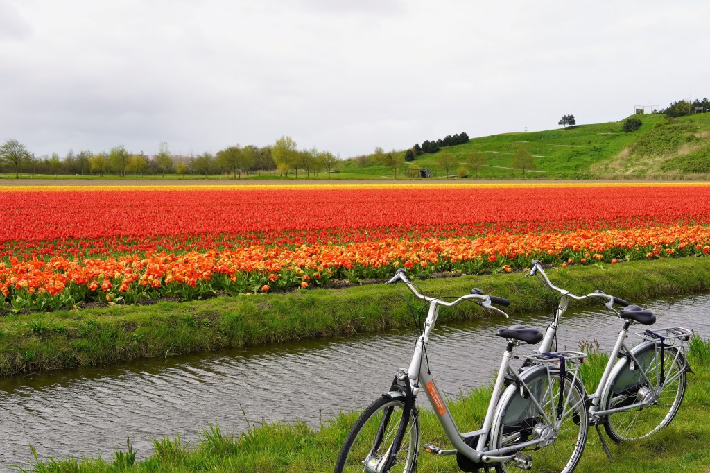 After a few hours of biking through the countryside, we stopped at Keukenhof Gardens for even more flowery fun. We weren’t sure if we wanted to go here, as we had heard stories of the insane tourist crowds that were confirmed when we passed by the gardens on our bikes earlier in the day. We were ultimately glad that we did, however, as the flower gardens are beautiful, and our timing of arriving towards the end of the day turned out to be a smart decision, as the Disneyland-esque crowds from earlier had all but disappeared and we had the gardens largely to ourselves (save this as a travel tip if going to see the Keukenhof Gardens is on your bucket list!). We enjoyed strolling the winding paths along the immaculate flowerbeds and picking our favorite combinations of colors.